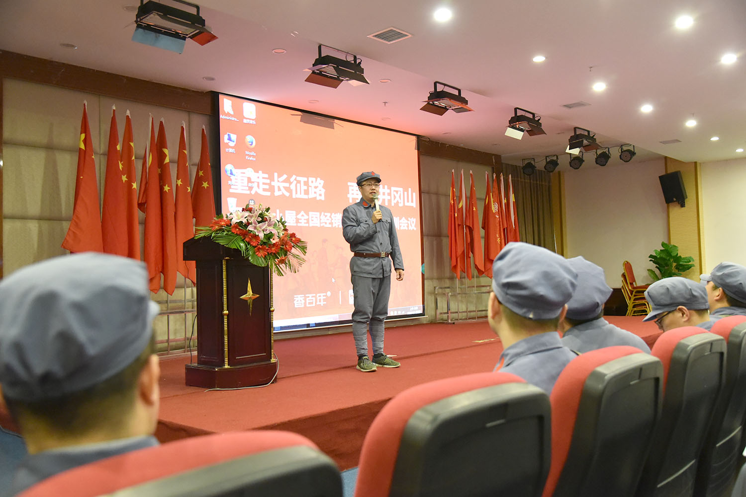 會上,香百年創始人姜海濤先生著重在香百年"一橫一縱"的層面上給大家分享了香百年未來的戰略布局。他表示思想層面決定行動,就如同革命先烈因為對未來充滿無比堅定的信念而一步步走向成功的道路。品牌也一樣需要無比堅定的信念,而團結則是革命成功的基石。